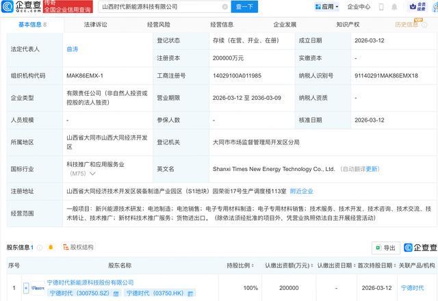 企查查APP线路,近日,山西时期新动力科技有限公司开拓,注册老本20亿元,筹画限度包含:新兴动力工夫研发;电板制造;电板销售;电子专用材料制造;电子专用材料销售等。企查查股权穿透线路,该公司由宁德时期(300750.SZ)全资捏股。