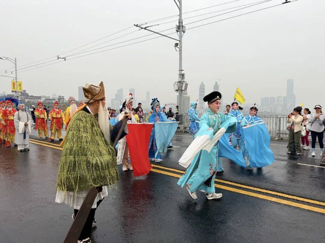 武汉戏船埠经典戏曲东谈主物巡游方阵首先登场,来自武汉京剧院、汉剧院、楚剧院的50名演员身着精熟戏服、佩带专科行头,以经典戏曲东谈主物形象亮相长江大桥,尽显“戏水长流,戏聚江城”的深厚底蕴。